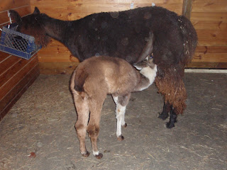 We had bred two llamas, but one absorbed her pregnancy, so Golden has many aunts. And while he loves them all, Tess is by far his favorite. If he could choose his mother, it would be Tess. She protects him totally, and Rev, Golden's mother, doesn't seem to mind. But then Tess and Rev grew up together, born 18 days apart. Golden has tried repeatedly to nurse from Tess, and surprisingly, Tess lets him. But when it come to being hungry and getting milk, he knows where Mother is. For the first two weeks, he added a pound a day, sometimes more. But lately, he has tapered off; he is gaining, but his energy output seems to offset his gains a bit. Luckily, I have a great scale that Carol recommended from Precision Solutions, so I can monitor his weight gain accurately.